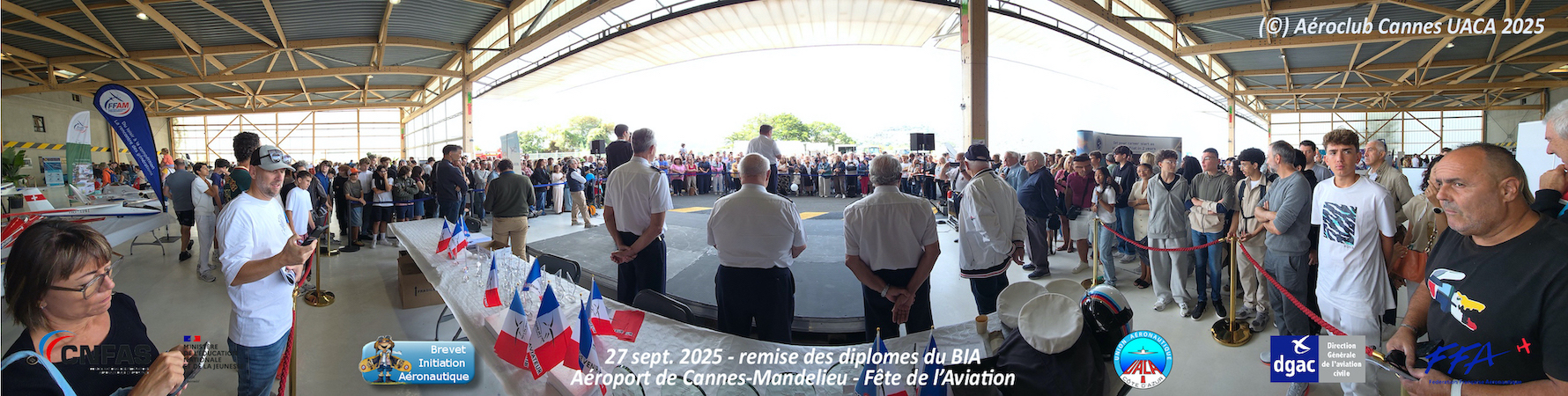 Cérémonie 2025 de remise des diplômes, organisée par l'aéroclub Cannes UACA avec le concours de l'aéroport de Cannes-Mandelieu. Plus de 500 personnes présentes : élèves, professeurs, Education Nationale, Armée de l'Air, fédérations aéronautiques...